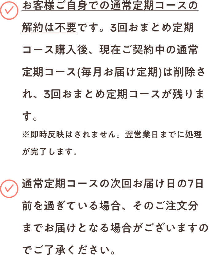 3回おまとめ定期コース購入後、現在ご契約中の通常定期コース(毎月お届け定期)は削除され、3回おまとめ定期コースが残ります。
