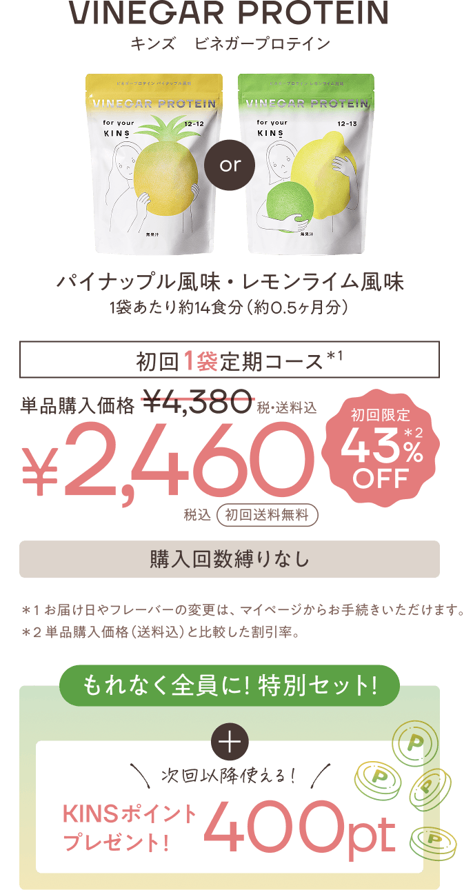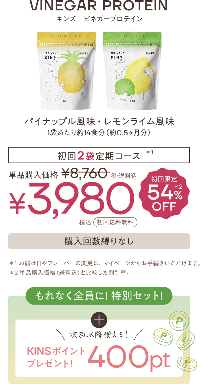 • ご解約のお手続きをいただくまでは、2回目以降、「VINEGAR PROTEIN 2袋セット」を定期的にお届けするお得な定期便です。 2回目のお届けは初回1袋の場合は約14日後、初回2袋の場合は約30日後となり、3回目以降は約30日ごとのお届けです。 2回目以降は6,480円(税・送料込)となります。