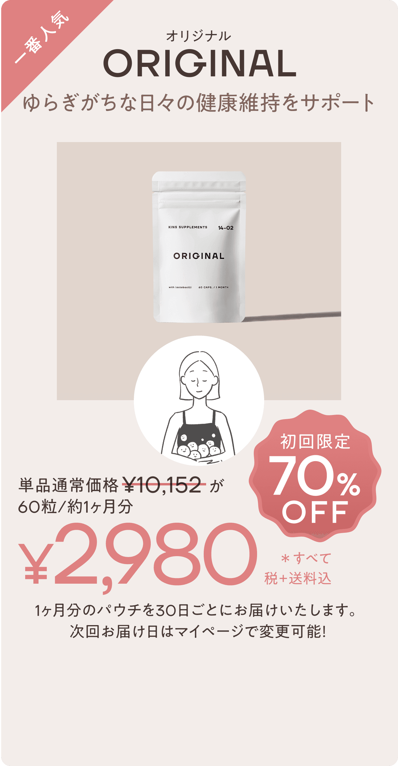 まずは3ヶ月を目安に続けていただくのがおすすめです。一般的に腸内環境が変わるには、4週から8週程度かかると言われています。ただ、もともとの状態や食生活、生活環境、ストレスなどにも影響されます。またサプリメントは、日常生活に不足しがちな栄養素や成分をおぎなうための食品であり、即効性のあるものではありません。そのため、無理せずじっくりと3ヶ月を目安に続けていただくことをおすすめしています。毎日の菌ケア*のサポートにお役立ていただけましたら幸いです。