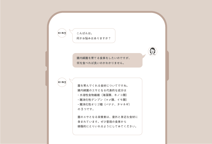 LINE上であなたのライフスタイルにぴったりな、菌ケアをご提案させていただきます。サプリメントを飲むだけでは、菌ケアとしては不十分。LINEでのヒアリングを通して、日頃の食生活の見直しなどもご提案させていただきます。